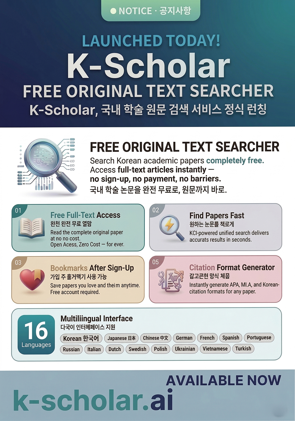 Free Original Text Searcher Launched 등록일2026.04.02 조회수91 https://www.korea-scholar.com/ 댓글 0댓글쓰기 댓글목록 등록된 댓글이 없습니다. 이전글 이전 글이 없습니다. 다음글 [안내] 2026년 설 연휴 기간 정상 업무 안내 목록